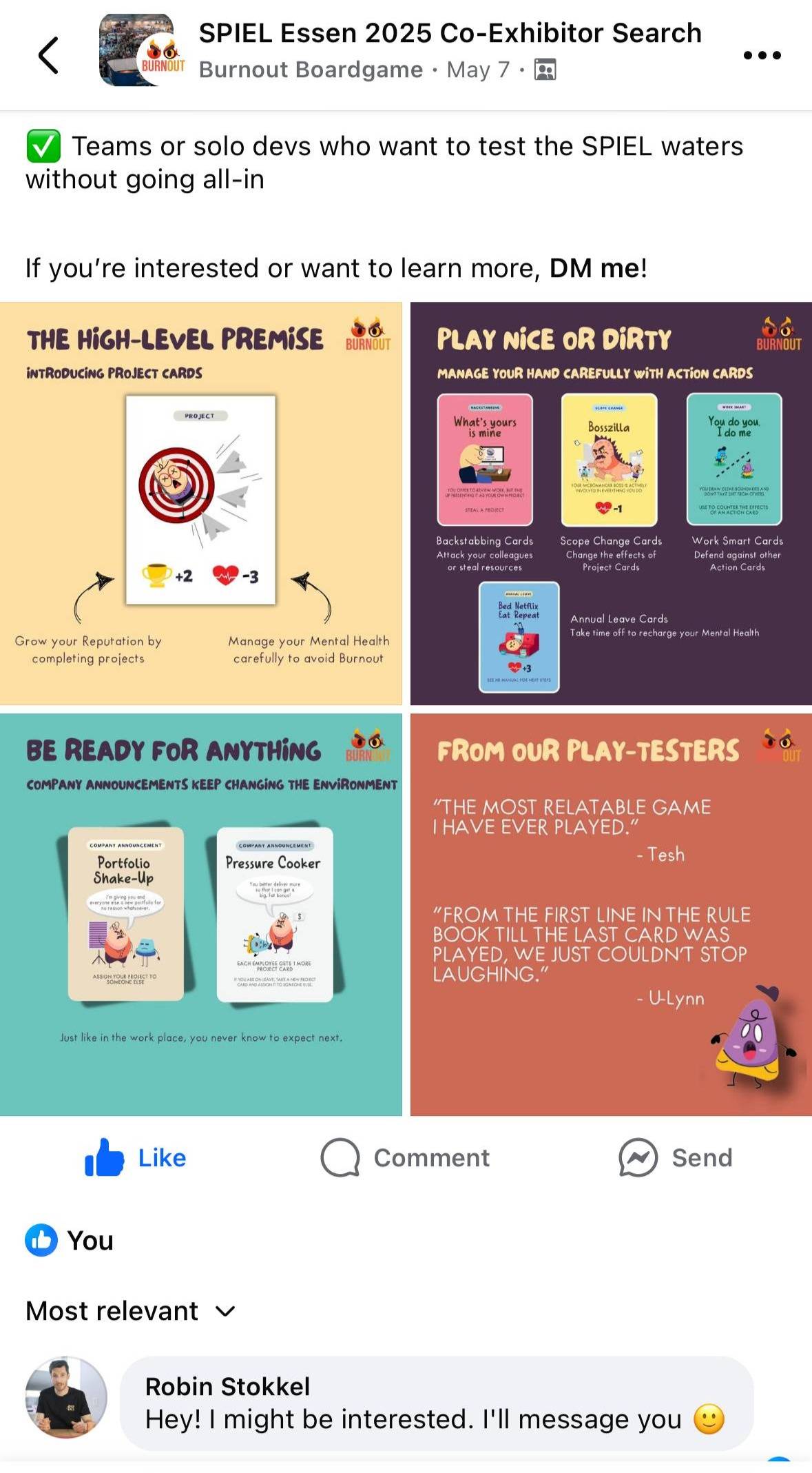 I decided to search for a publisher looking to share their booth. Fortunately, there’s a lovely Facebook Group for this. This is where I found Burnout Games’ post. They were already registered for a 15 square meter booth, and were at the top of the waitlist.