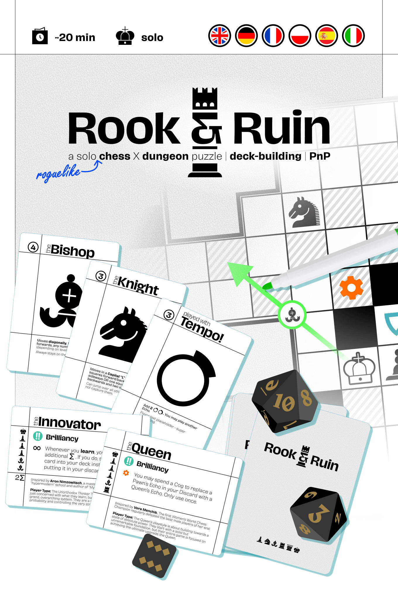 Rook&Ruin is a chess rogue-like deck-builder that can be played as a roll & write by using a multi-column table.